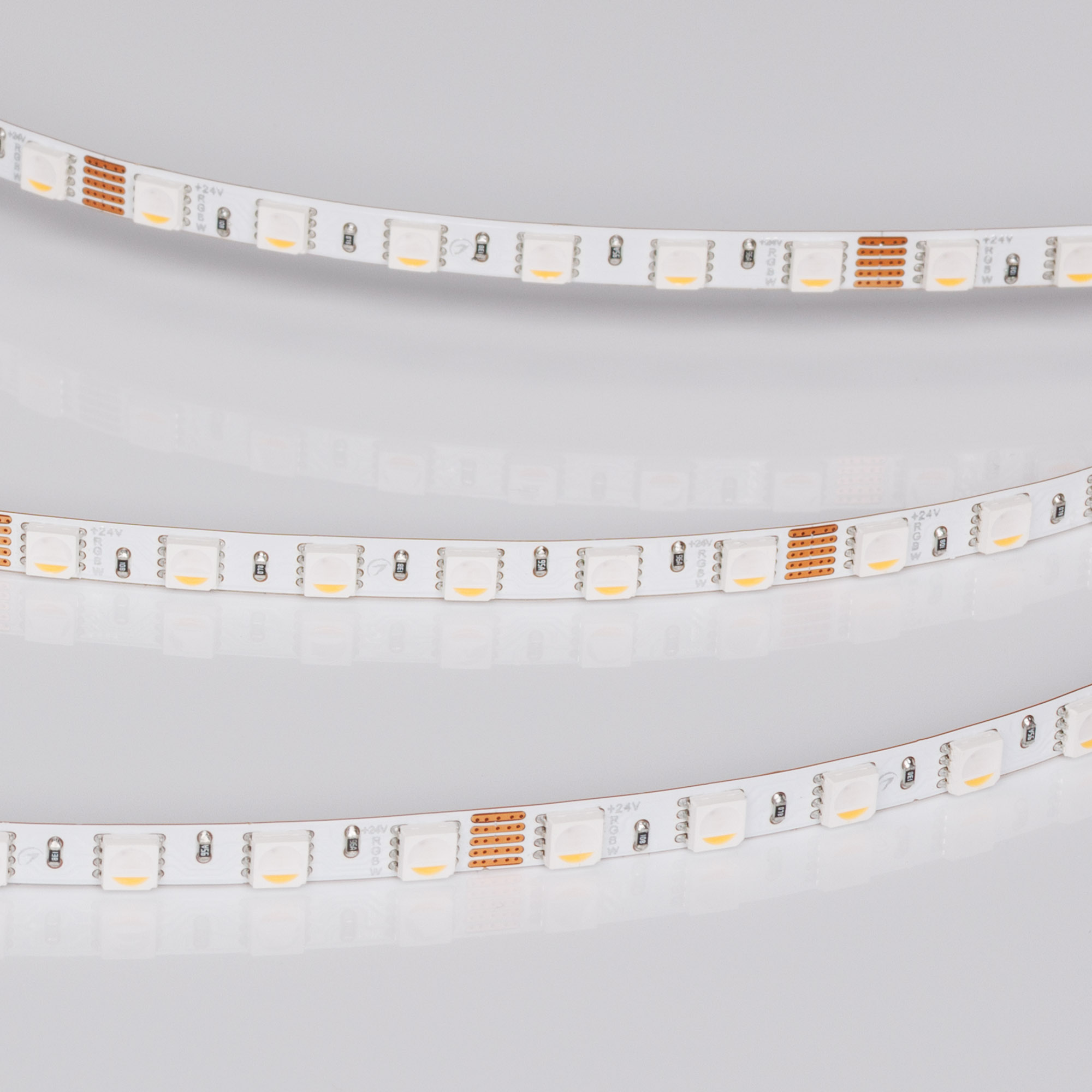 Светодиодная узкая лента RT серии H96. Светодиоды SMD 4040, 96 шт/м, белая плата, ширина 5 мм, скотч 3M. Цвет RGB + ДНЕВНОЙ 4000K, индекс цветопередачи CRI>90, угол 120°. Питание 24 В, мощность 10 Вт/м (50 Вт на 5 м). Размеры 5000x5x2 мм, мин. отрезок 62.5 мм, 6 светодиодов. Цена за 1 м. Обязательна установка на профиль.